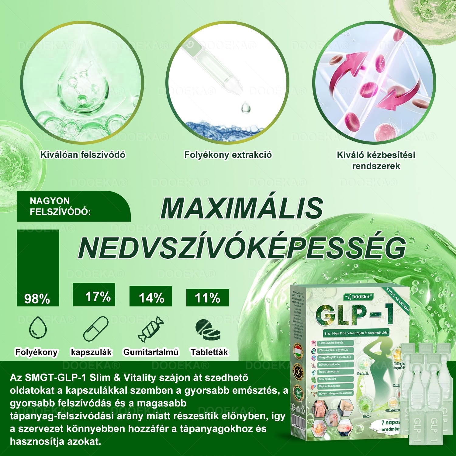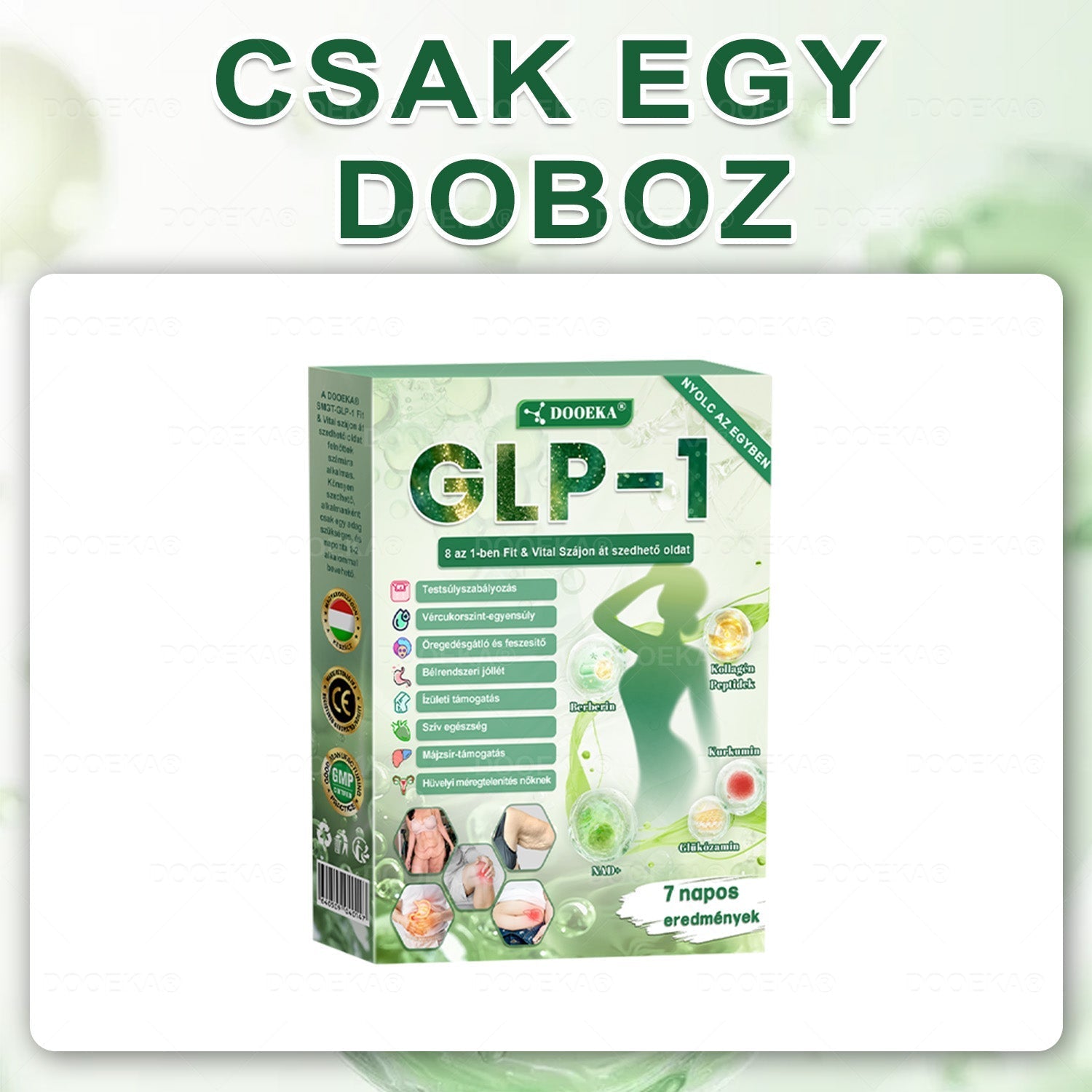 A DOOEKA® GL𝐏-1 8-𝒊𝒏-1 Fit & Vital Orális Oldatot több mint 30 nemzetközi endokrinológiai és diabetológiai szakember fejlesztette ki több mint 3 év kutatás után. A készítmény a Meglutide-ot erőteljes gyógynövényes összetevőkkel kombinálja, hogy támogassa az anyagcserét, felgyorsítsa a zsírégetést és támogassa az emésztési és nyirokrendszeri egészséget. A testsúlycsökkentéshez szükséges további támogatás érdekében a formula kollagén peptideket is tartalmaz, amelyek serkentik a kollagén szintézisét a bőr feszességének javítása, a megereszkedett bőr és finom vonalak csökkentése, valamint a gyors fogyás okozta bőrlágyulás mérséklése érdekében. Az orális oldatot a Magyarországon a CE tanúsítvány jóváhagyta biztonságossága és hatékonysága alapján, tudományosan megalapozott megoldást kínálva a fogyás és a teljes testi jólét érdekében.